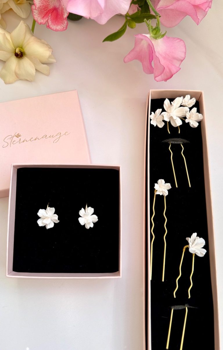 Wenn ihr (zusätzlich) Haarschmuck möchtet, würde ich Schmuck mit Blüten wählen, wie hier z.B. von Sternenauge.