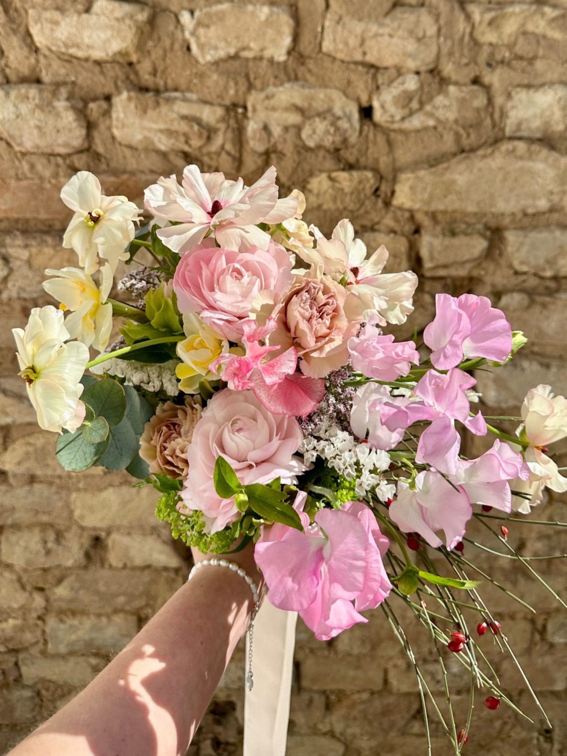 Verschiedene Blüten und Zweige, wie Ranunkeln, Schmetterlingsranunkeln, Astern und Blütenstände vom Ginster wurden hier zu diesem frühlingshaften Brautstrauß verarbeitet. Abgerundet mit langen Bändern in puderrosa wurde aus einer Idee ein wahrer Blütentraum.